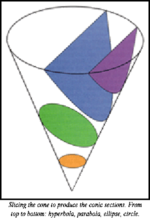 Circles don’t just arise out of thin air. We start with a cone. [8] We slice the cone at some angle to its axis. The face of the cut-off section will have a shape called a conic section, of course. In general, those shapes are parabolas, hyperbolas, or ellipses of varying eccentricity or elongation depending on the angle of the slicing. I am tempted to note that eccentricity is also a human characteristic engendering charismatic charm and creativity or quirkiness and possibly a medical disorder. Fortunately, our circle is a very special conic section. It is obtained by slicing the cone at right angles to its axis. It has no eccentricity at all, good or bad. We must assume that it gets its charm from another source.