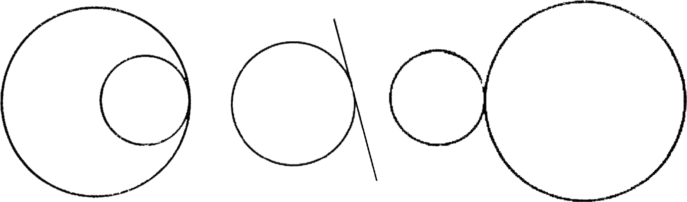 A circle could be mistaken for the letter ‘O’ or for the number ‘0’ even though some fonts make the zero look more like an oval. A true circle deserves a special place in the galaxy of geometric shapes. All closed figures let us distinguish between the inside and the outside as two regions of the plane [1], but there is something about the purity of the circle that mesmerizes. Its boundary just travels smoothly around a full 360 degrees without a wiggle or a bump. The line of a figure that curves nicely around anything need not be closed to have a tangent. The tangent is just another line associated with another geometric shape that touches our first one, a very close encounter. But I like to see the ideal situation when the second shape is either a straight line or another circle as shown below.